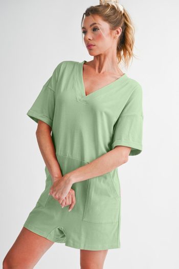 Rompers | Grass Green Loose Half Sleeve V Neck Plain Romper – Women