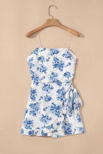 Rompers | Sky Blue Floral Print Zipped Back Knot Waist Ruffle Hem Romper – Women