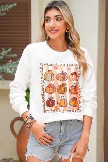 Women Sweatshirts | White Fall Bow Pumpkin Round Neck Graphic Sweatshirt