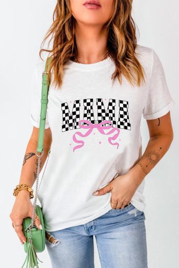 Women Tees & Tanks | White Checkered Mama Ribbon Bow Graphic Crewneck Tee