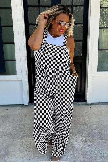 Jumpsuits | Black Checkered Print Pocketed Wide Leg Overall – Women