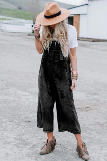 Jumpsuits | Black Distressed Bib Pocket Wide Leg Denim Overall – Women