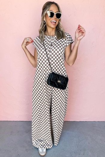 Jumpsuits | Khaki Checkered Print Buttoned Crew Neck Wide Leg Jumpsuit – Women