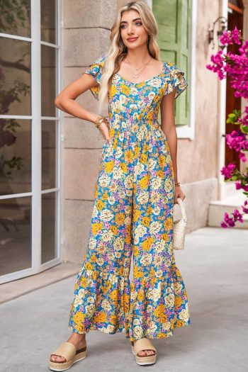 Jumpsuits | Yellow Floral Allover Print Shirred Cut Out High Waist Jumpsuit – Women