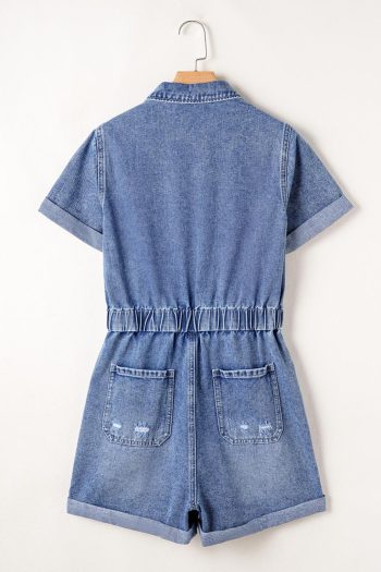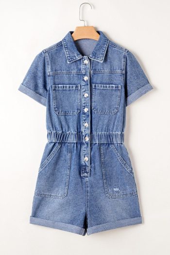 Rompers | Dusk Blue Chest Pocket Front Buttoned Folded Edge Denim Short Sleeve Romper – Women