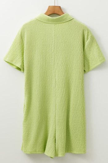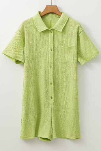Rompers | Meadow Mist Green Textured Short Sleeve Patched Pocket Buttoned Shirt Romper – Women