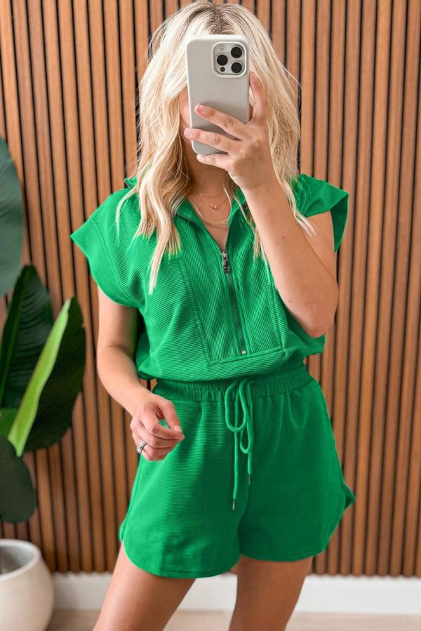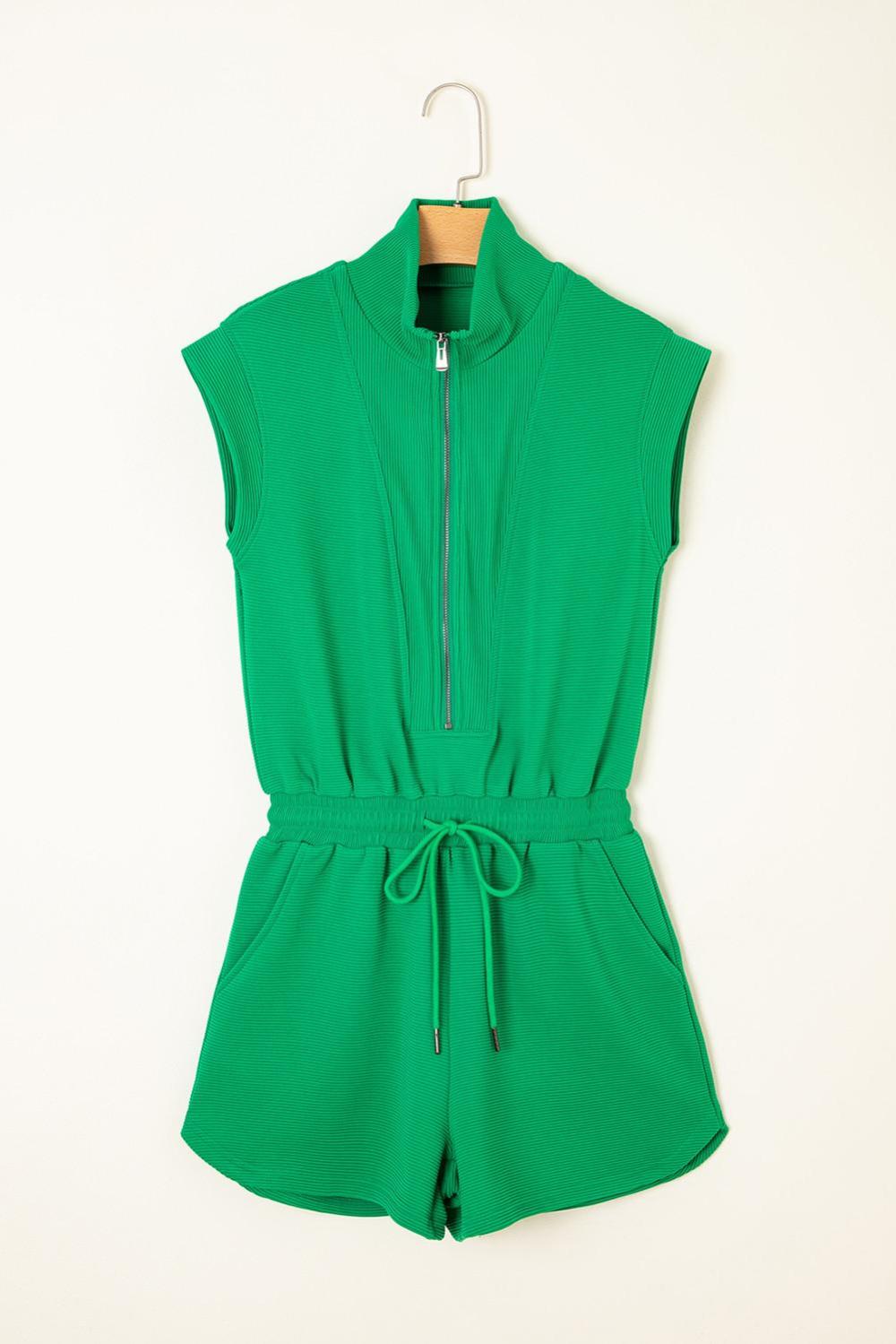 Rompers | Bright Green Textured Short Sleeve Half Zip Drawstring Waist Romper – Women