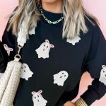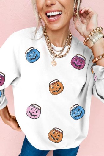 Women Sweatshirts | White Halloween Pumpkin Lantern Sequin Patched Sweatshirt