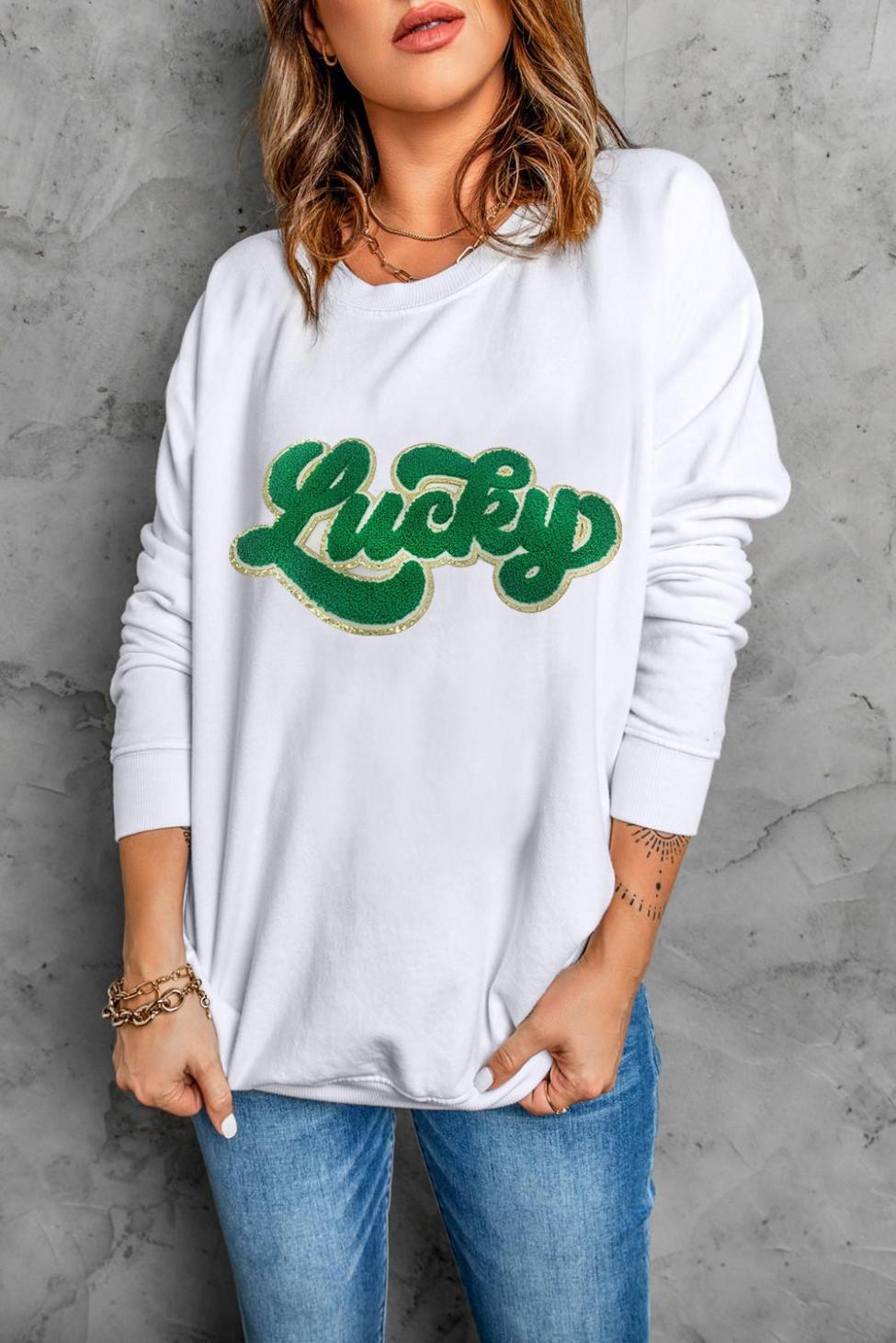 - The Chenille Embroidered "Luck" Adds A Shining Touch To This Classic Sweatshirt For Women.