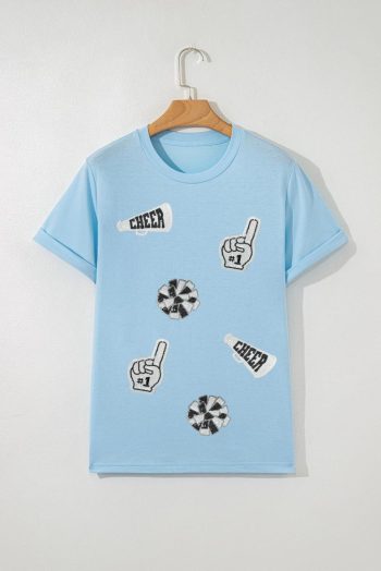Women Tees & Tanks | Light Blue Cheer Game Day Element Sequin Patched T Shirt